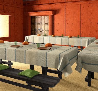 Above we have the dining room of the castle. Interestingly, the floor in question is not only of wood. Was placed mortar on the floor, much like the floors we have today, but matte. The wall, in contrast, has coated veneers.
