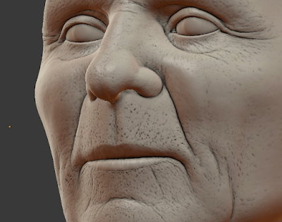 The region of the face undergoes a process called retopo, where a more organized 3D mesh involves the base sculpture and receives more data, such as the ears and muscles.